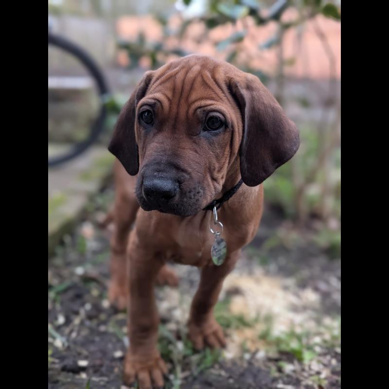 AT 0 ano(s), 3 mês(es) e 17 dia(s), Léon, Rhodesian Ridgeback masculino , pesado 14.2 kg.