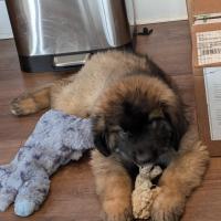 AT 0 ano(s), 6 mês(es) e 5 dia(s), Doc, Leonberger masculino , pesado 42 kg.